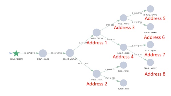 首先,地址(3CA...AcW)将 30.6675 BTC 分为小额 2.27 BTC 和大额 28.39 BTC 分别转到地址 1 和地址 2;接着,地址 1 将 2.27 BTC 分为小额 0.16 BTC 和大额 2.11 BTC 分别转到地址 3 和地址 4;地址 3 再以同样的方式将 0.16 BTC 分别转到地址 5 和地址 6,其他地址同理。