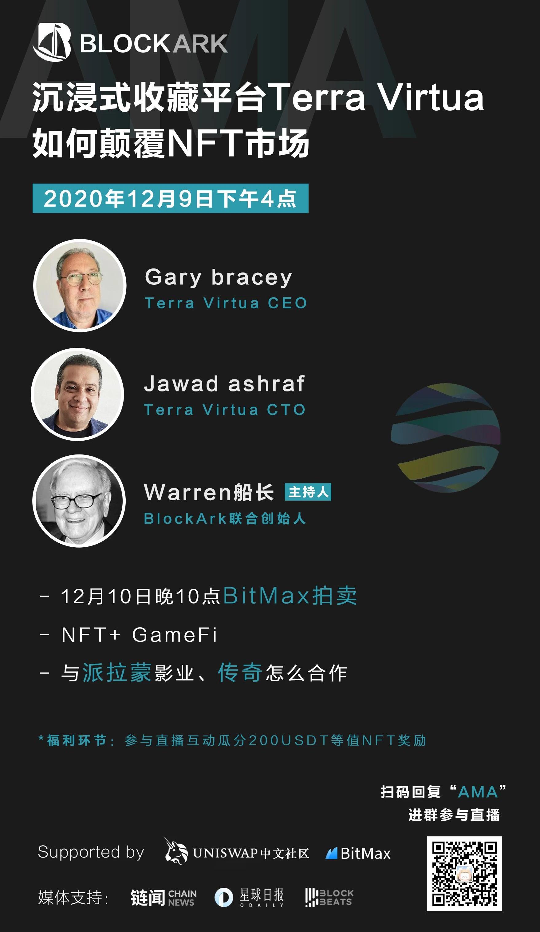 2020年12月9日下午4点,TerraVirtuaCEOGarybracey、TerraVirtuaCTOJawadashraf做客Uniswap中文社区,由BlockArk区块方舟联合创始人船长主持,进行了“沉浸式收藏平台TerraVirtua如何颠覆NFT市场”的主题AMA直播。本次直播活动由区块方舟BlockArk和BitMax支持,链闻ChainNews、星球日报Odaily、区块律动BlockBeats媒体支持,直播分享内容整理如下: