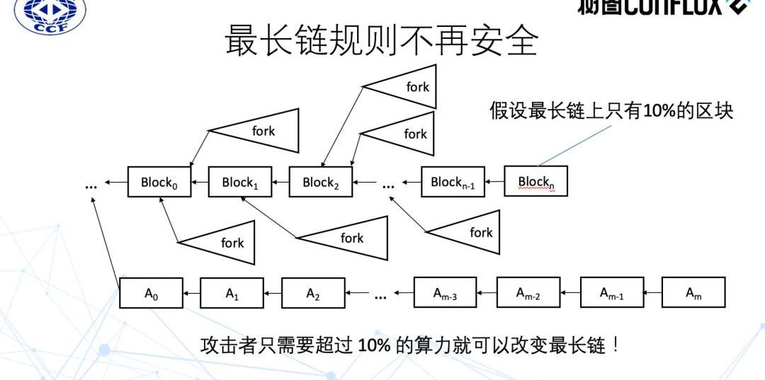 杨光博士指出,现有区块链网络采用的共识算法,都专注于最长链规则,这种规则实际上闲置了吞吐量的提升,而且为理想区块链的实现埋下了安全隐患。