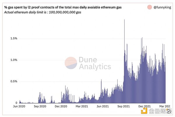 L2每天的平均gas消耗不到以太坊网络的1%。 随着升级到Optimistic Rollup和Arbitrum(calldata压缩),这个图表短期内可能会走低。 扩容方案Arbitrum?Nitro最近已经推出,Optimism 升级将于下周上线。