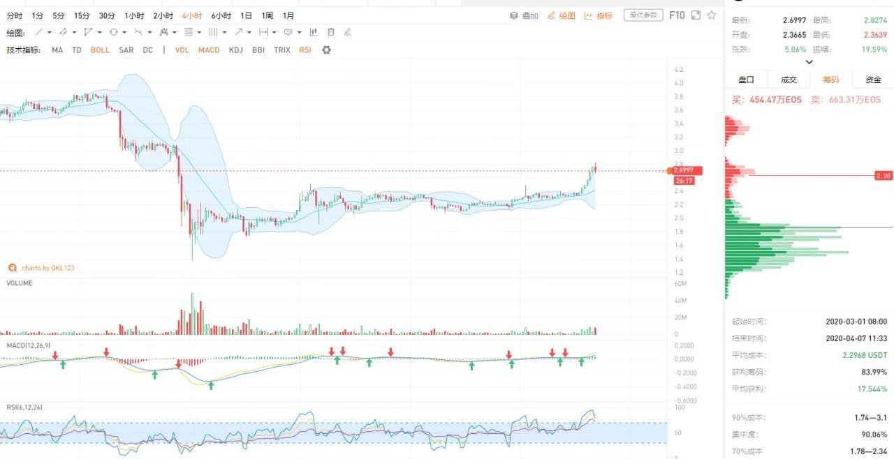 昨日下午BTC开始快速拉升,短时伴有小幅的明显放量,成功站上7000美元,上方空间看到7800美元的筹码集中区域。目前,山寨币涨幅较大,相对比特币明显强势,说明市场形成一致看涨预期,后续会有一定的惯性上扬,但短时临近超买,可能会有所回调。叠加全球疫情放缓预期和比特币区块减半预期利好,近期有望走出一波行情。