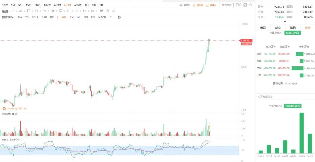 昨日下午BTC迎来变盘向上,没想到走势会如此之强。站上8000美元之后,出现明显的放量拉升,并在8800美元稍有调整之后,今日直接冲上9000美元关口。比特币的再次放量走出,可以作为熊转牛信号,后续走势看好,大概率会走出一波行情。但短时RSI超买严重,有一定的回调需求。