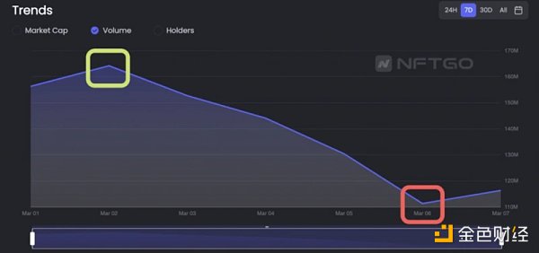 根据NFTGo数据,虽然 NFT 持有地址在缓慢上升,然而,相比于30天前的每日51740的交易地址数量,目前,每日交易地址下降了70%,约为1万地址。