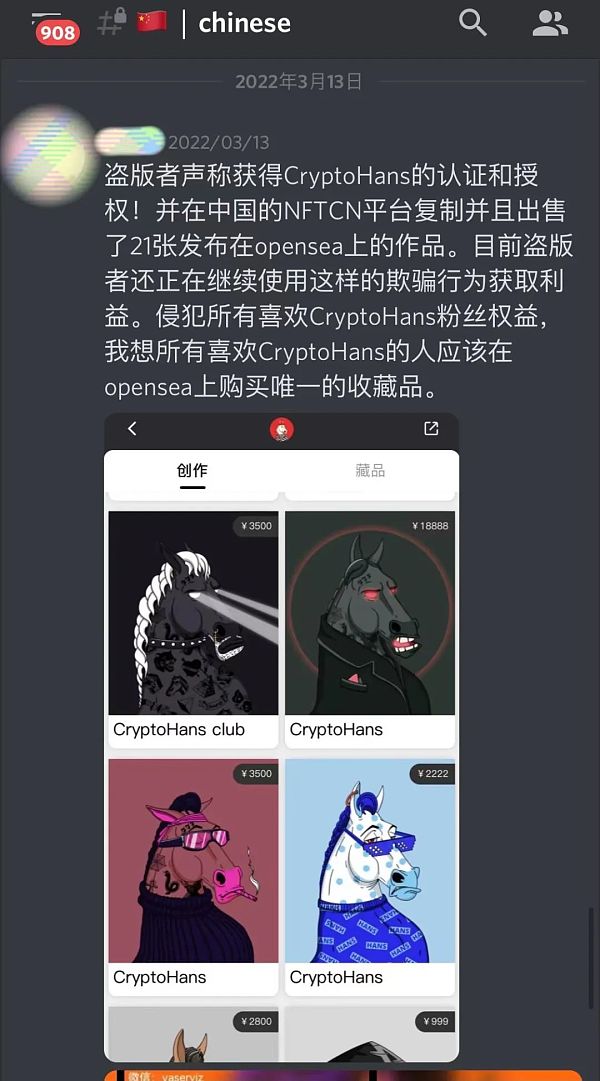 而国内媒体几乎没有对此艺术家的报道,可能是信息不对称的原因,于是有人“光明正大”的冒用CryptoHans 的账号在某社交平台和中国的某NFT交易平台上做了“官方认证”。并发布了一些作品,这些作品与国外NFT交易平台上的作品,从颜色、形象、细节、名称、创作时间、包括艺术家,几乎所有信息都是一致的。