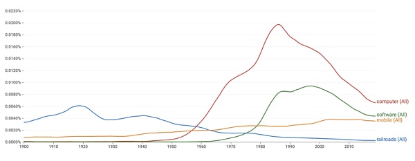 我从埃文斯的演讲中得到的最喜欢的启示是,当技术完全普及时,它就会消失。你可以用几乎所有的技术革新来测试这个理论。下面,我用铁路、电脑、软件和手机这些词进行了测试,查找了从 1900 年到今天每个词在谷歌图书语料库中的频率。