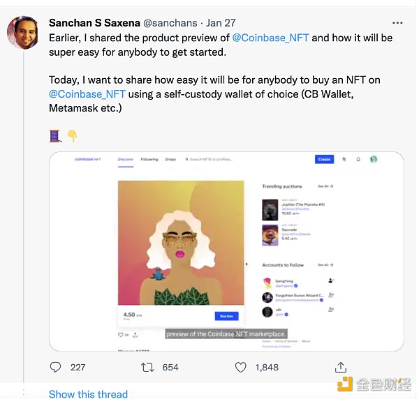 1 月 27 日,Coinbase 产品副总裁 Sanchan Saxena 在个人社交媒体平台公布了 Coinbase NFT 市场的用户体验预览。该短视频显示 Coinbase NFT 平台支持使用自托管钱包(CB Wallet、Metamask 等)购买 NFT,同时披露了其 NFT 市场的界面、UI 设计和购买流程。Sanchan Saxena 表示,用户可在该市场上购买任何平台上铸造的 NFT。最后,这些 NFT 也会出现在用户的个人资料中,可以随时隐藏,或者立即上架出售。