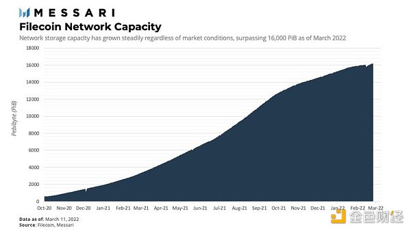 得益于其开放市场政策和激励机制,Filecoin能够吸引大量存储容量。无论最近的市场情况如何,Filecoin的承诺存储容量都稳步增长到超过16,000PiB,这相当于截至2022年3月大约65,000份维基百科或1,600个Netflix电影档案。网络容量来自分布在全球各地的3,900多家去中心化存储提供商。