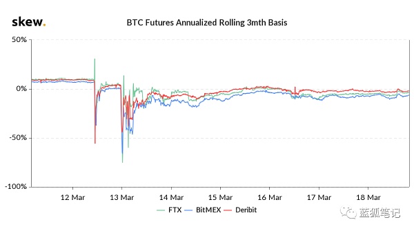 因此,3月13日,比特币期货的年化三个月滚动基点,其计算了期货和现货计价的现货之间的价格差,在加密衍生品交易所FTX上下跌了-75%,罗瑟姆形容它为“狂野”。