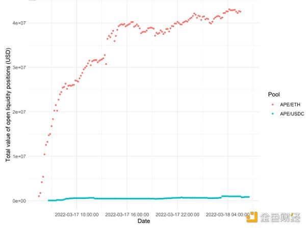 有趣的是,绝大多数流动性头寸是在APE/ETH矿池中生成的,而不是在APE/USDC矿池中生成的。相应地,APE/ETH池也包含以美元计算的大部分流动性: