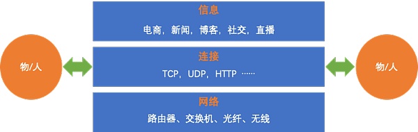 实际上,在讨论互联网的时候,我们往往讨论得更多的是信息和连接,物理网络层则被归结为了通信,因为物理网络一般是由传统的电信网络提供商提供的,这部分与互联网应用本身并不直接相关。