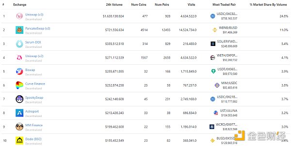 过去24小时去中心化交易所的交易量 数据来源:coingecko