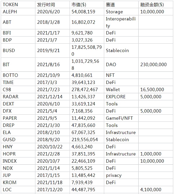 以下对一些相对小众的 Token 做一下简单介绍,按市值排序。表格中,前 45 个属于以太坊生态,后 5 个属于 Solana 生态。其中,市值超过 1 亿美元的仅 5 个:BUSD、BIT、C98、GUSD 和 STRK,而市值不足 1000 万美元的多达 15 个。不仅如此,Coinbase 还将上线 10 个 2020 年以前发行的 token,这其中除了 BUSD,其余早已淡出我们的视线。