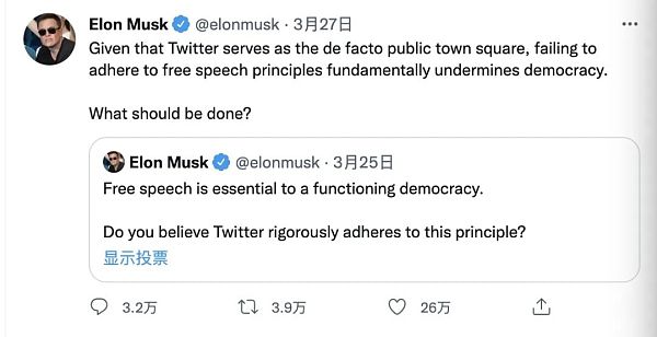 27 日,他再次转发投票结果,称推特虽为事实上的「公共舆论广场」,但发言有诸多限制,未能遵守言论自由原则,破坏了民主。