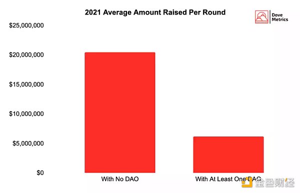 从投资金额上看,2021 年传统加密 VC(除开投资 DAO 之外)平均投资金额为 2050 万美元,而投资 DAO 则为 620 万美元。