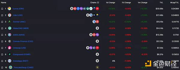 DeFi项目锁定资产前十排名及锁仓量 数据来源:defillama