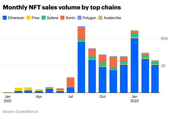 基于区块链的游戏在2021年因Axie Infinity的崛起而盛行。8月份,Axie Infinity NFT的销售额达到了惊人的8.48亿美元,之后急剧下降。(值得注意的是,尽管趋势发生了明显的逆转,并且出现了严重的黑客攻击,但在3月份,Axie的NFT销售额仍然达到了3000万美元。)