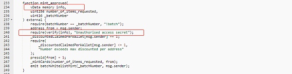 4月21日,NBA的NFT项目合约遭受攻击,攻击者利用了签名未验证,在合约代码中,vData memory参数info在传入函数中未进行验证导致签名可复用,攻击者可以通过使用其他人的签名来进行Mint,导致项目方被疯狂“薅羊毛”。
