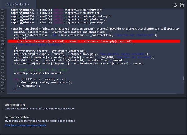 漏洞描述:chapterAuctionMinted的值永远为初始值,但是在此处使用的判断条件中,使用了该值进行条件检查。如果在开发期间使用[链必验]扫描后,开发者可根据扫描结果判断是否是相关逻辑缺失(可能导致NFT超量发放等业务逻辑安全问题),亦或是冗余代码。