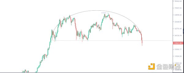 从图中可以看到,随着BTC近期持续回落,快慢两线逐步靠拢,后面将有死叉转红可能,不过目前还有段距离,还需要时间,2018年熊市两线死叉转红后BTC才最终见底,死叉前也是大幅度回落,2014年熊市也是两线死叉后才最终见底,目前BTC行情并未企稳,圆弧顶刚形成,超跌反弹后将有继续下探可能,注意风险。