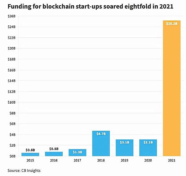 根据CB Insight的数据,区块链初创企业去年筹集了创纪录的 250 亿美元的风险投资,是前一年的八倍多。