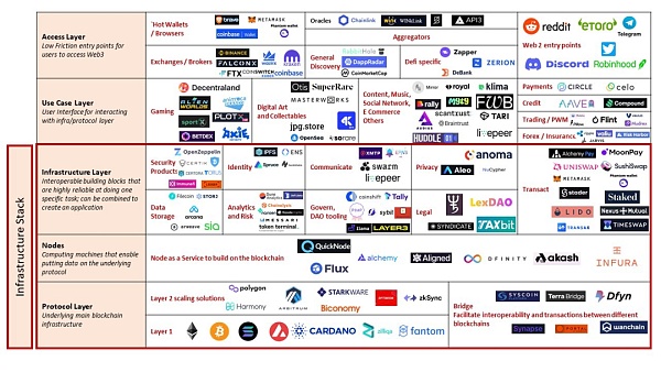 世界继续转向 Web 3.0 ,而目前全世界只有 0.71%2 的人在使用区块链技术,去中心化的基础设施堆栈将有助于确保主流大众而不仅仅是区块链 "创新者"1加入 Web 3.0 的世界。无论是供应链管理(Scantrust)、气候变化(Klima)、内容发布(Mirror)、创收(Axie Infinity)还是海外援助(乌克兰DAO)等等,去中心化技术的新用例不断出现。抛开围绕着个人对中心化权威机构(如政府或大型 Web 2.0 捍卫者)的挫败感和低信任度展开的辩论,大部分人选择投入 Web 3.0 是出于功利的目的,而不是出于意识形态的转变。这进一步说明了建立去中心化的基础设施堆栈的重要性,它为 Web 3.0 提供动力,使其成为一个可靠的替代方案,获得开发者和用户的信任。