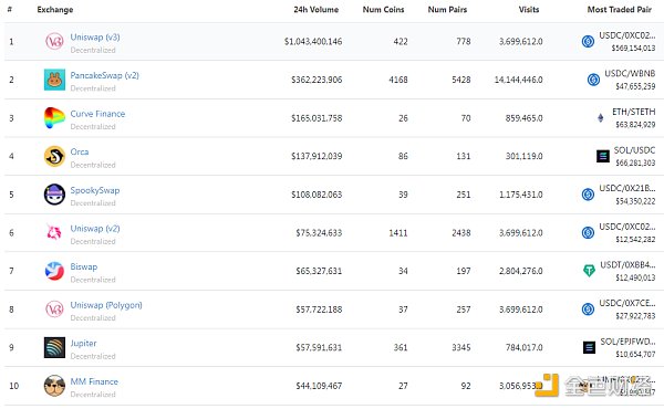 过去24小时去中心化交易所的交易量 数据来源:coingecko
