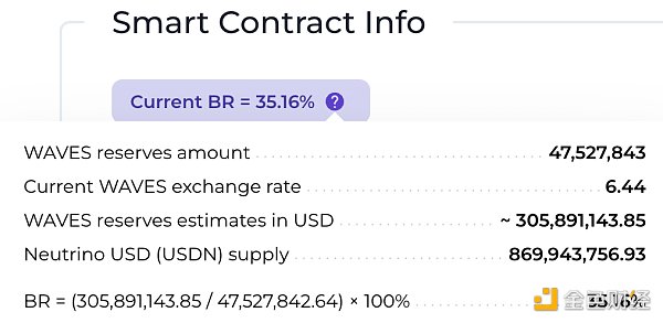 USDN 已经持续维持小幅度的脱锚,当前价格为 0.976 美元。Neutrino 官网显示,USDN 发行量为 8.7 亿,而对应的 WAVES 储备金价值为 3.06 亿美元,抵押率只有 35.16%。