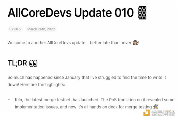 而在3 月 26 日,以太坊核心开发者 Tim Beiko 总结了最新一次的核心开发者会议内容,包括合并测试网 Kiln 进展、难度炸弹、上海升级、以太坊执行层工作进展等等。?