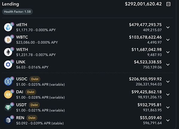 截止6月14日,Celsius 在AAVE有5.94亿美元的抵押品,其中超过4亿美元是stETH,共借出了3.06亿美元资产。