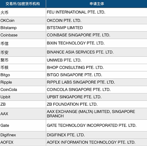 下表为金色财经记者整理的,位于新加坡金管局豁免名单中的交易所或者加密货币机构名单(持续更新)。