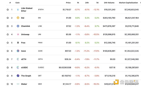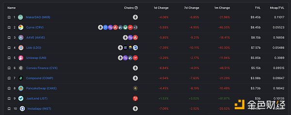 DeFi项目锁定资产前十排名及锁仓量 数据来源:defillama