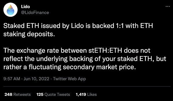 然而,Lido/stETH 的迅速崛起以及 Terra 的崩溃导致了 stETH-ETH 汇率出现了一些问题。5 月,stETH 开始以低于 ETH 5% 的价格交易,引发了最初的担忧。上周,这种折扣再次出现,引发了 Celsius 流动性问题的开始。