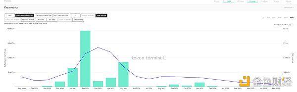 dHedge 月收入(绿色)和完全稀释估值(蓝色)