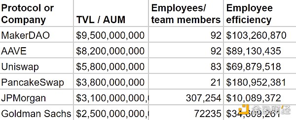 去中心化金融 (DeFi) 拥有众多协议(将这些视为公司),至少在市值方面,它们比传统金融 (TradFi) 同行具有更高的资本效率。