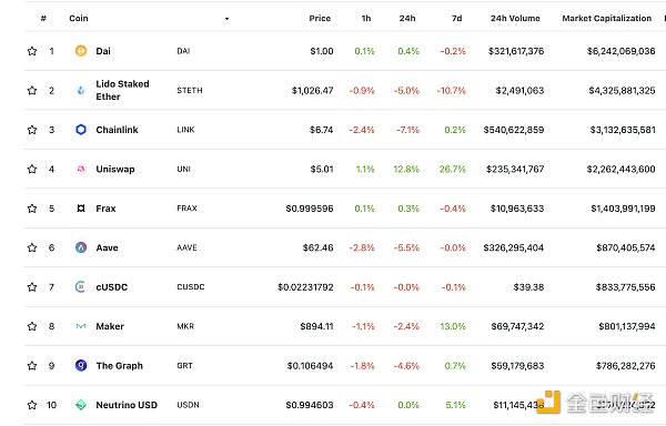 DeFi项目锁定资产前十排名及锁仓量 数据来源:defillama