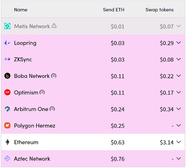 从交易成本的角度来看,目前各大Layer2每执行一次swap消耗的手续费在0.07-0.3美元之间,以太坊上超过3美元。由Layer2来代替以太坊主网执行交易可以节省90%以上的交易费用。