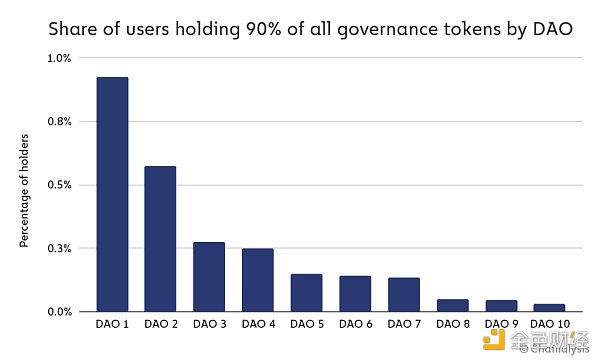 通过分析十个 DAO 治理代币的分布,我们发现在几个主要 DAO 中,不到 1% 的持有者拥有 90% 的投票权。
