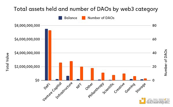 专注于风险投资、基础设施和 NFT 的 DAO 也有较大占比,这表明 DAO 对投资者、开发人员和艺术家都具有吸引力。但是他们的链上资产价值相对较小。