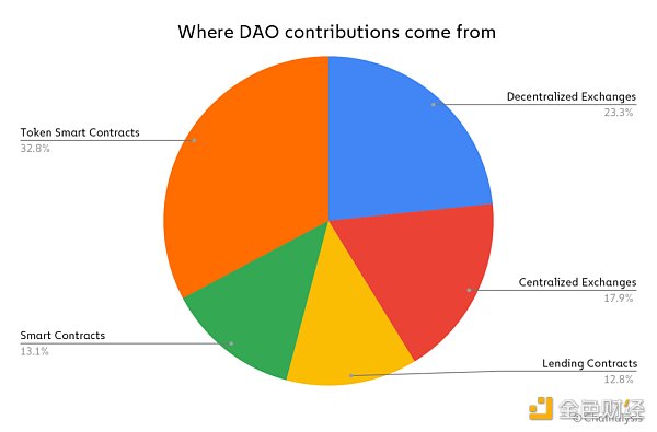 正如所料,DAO 参与者是加密货币服务的高级用户。DAO 国库资金中只有 17.9% 来自中心化服务,其余 82.1% 来自去中心化服务。这表明大多数 DAO 贡献者也使用了 DeFi 平台来托管他们的加密货币。