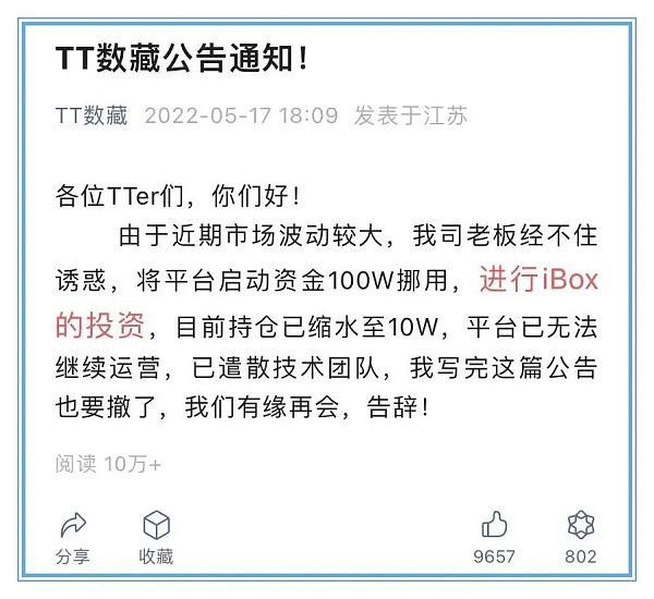 「昌盛数创」则发布了《停止运营公告》,并表示「如今的数字藏品市场还存在众多痛点亟待解决,IP版权难确权、市场监管趋严、市场机制失灵,老玩家被二级市场套牢,新玩家进不来数字藏品的二级市场,俨然走入了“死胡同”;本公司决定退出数藏圈,在这里也呼吁所有数藏用户一定要理性看待数字藏品,切勿轻易入场」。