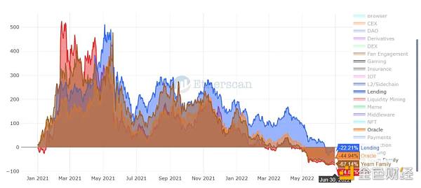 4个回报率为负的类别分别是Lending、Oracle、API和 Yearn Family。