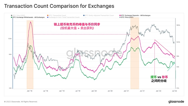 交易所仍然是比特币市场基础设施的核心,每天有价值数亿至数十亿美元的比特币在链上流动。交易所的存入和提币的数量,往往显示出对现货价格的高度敏感性和关联性。