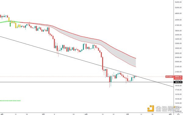 如图所示,BTC下方周线指数已下滑至图中圆圈0轴附近,价格也已跌至折线绿转红区域,并且下方快慢两线也已跌至红色虚线位置,本周反弹阳线带动快线拐头上行,后面有金叉慢线迹象,只是时间问题,我们看2014年和2018年熊底也都具备以上特征,后面长时间震荡筑底,然后发力重新站上,指标线上行然后启动新一轮牛市行情。