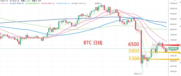 BTC 下方支撑在5900,和5300附近,上方压力在6500 附近,我认为疫情再没有得到有效控制前,市场主基调还是窄幅震荡为主。操作上保留底仓,再拿小仓位在支撑位附近挂单低吸,在压力位附近挂单高抛,机动仓位放低预期,单次有3-6个点利润见好就收,保持手感为主,大规模战役在后头。