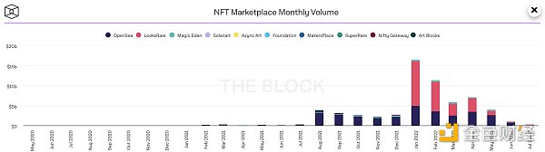 据 The Block Research?数据显示,在 5 月至 6 月期间,NFT的月交易量从40亿美元下降到了10.4亿美元,降幅达 74%。