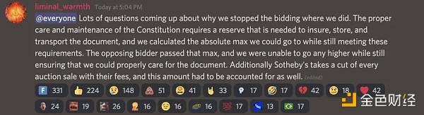 但由于链上数据透明可查,Constitution DAO 基本属于明牌竞拍,在竞拍价超过 4000 w 美元时 Constitution DAO 选择了放弃,因为剩下的金额不足以去承担文件保管费等,最终该副本以 4300 w 美元成交。之后 Constitution DAO 开启了退款通道,并宣布所有权力交给社区,停止运营;这场载入史册的实验最终也走到了尽头。