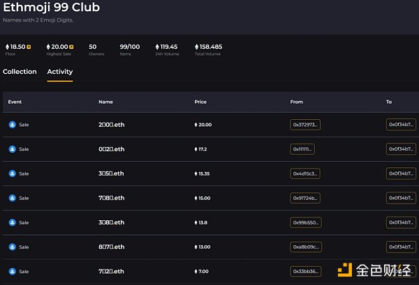 此外,Ethmoji 筹码较为集中,有人在 6 小时内以总共 101.35 ETH 的价格购买了 7 个 Ethmoji 99 域名,占供应量的 7% (Ethmoji 99 域名共 100 个),这也将其地板价从 ?7 ETH 带到 18.5 ETH。