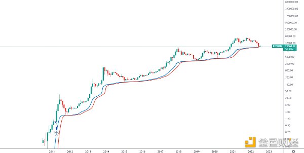 如图所示为BTC长期月线走势,可以看到一旦下方指标快线跌至0轴以下,BTC往往会到达各轮熊市底部区域,后面开始长时间底部盘整,然后伺机发动下一轮牛市,目前快线再次跌至0轴下方,下图月线长期支撑线上月大跌也未跌破,前期BTC贴近均形成各轮熊底,不破依旧可逢低布局,目前已上移至17000-18000。