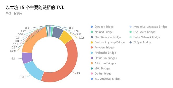 随着区块链的发展,目前已经进入一个以太坊为核心多链并存的局面,链与链之间的资产转移、 智能合约的跨链交互已成为链上活动的日常,跨链桥作为区块链基础设施的地位越发凸显。根据 Dune Analytics 数据,截至 6 月 30 日以太坊中 15 个主要跨链桥的锁定总价值(TVL)约 83.9 亿美元。目前 TVL 最高的是 Polygon Bridges(35 亿美元),排名第二的是 Arbitrum Bridge(18.93 亿美 元),随后是 Avalanche Bridge(12.41 亿美元)。