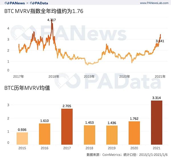 在BTC持续放量上行,并以29001.72美元的价格刷新历史最高价格的背景下,市场普遍看好BTC在2021年延续上涨趋势。其中一个判断依据就是MVRV。该指数是一种反映长期投资者偏好的指数,代表流通市值与实现市值的比值,如果大于1,意味着当前价格高于市场参与者的总体价值共识,定价被高估,且数值越大意味着定价被高估的程度越高,反之亦然。截至12月31日,MVRV指数约为3.141,低于2017年12月7日4.717这一前高。